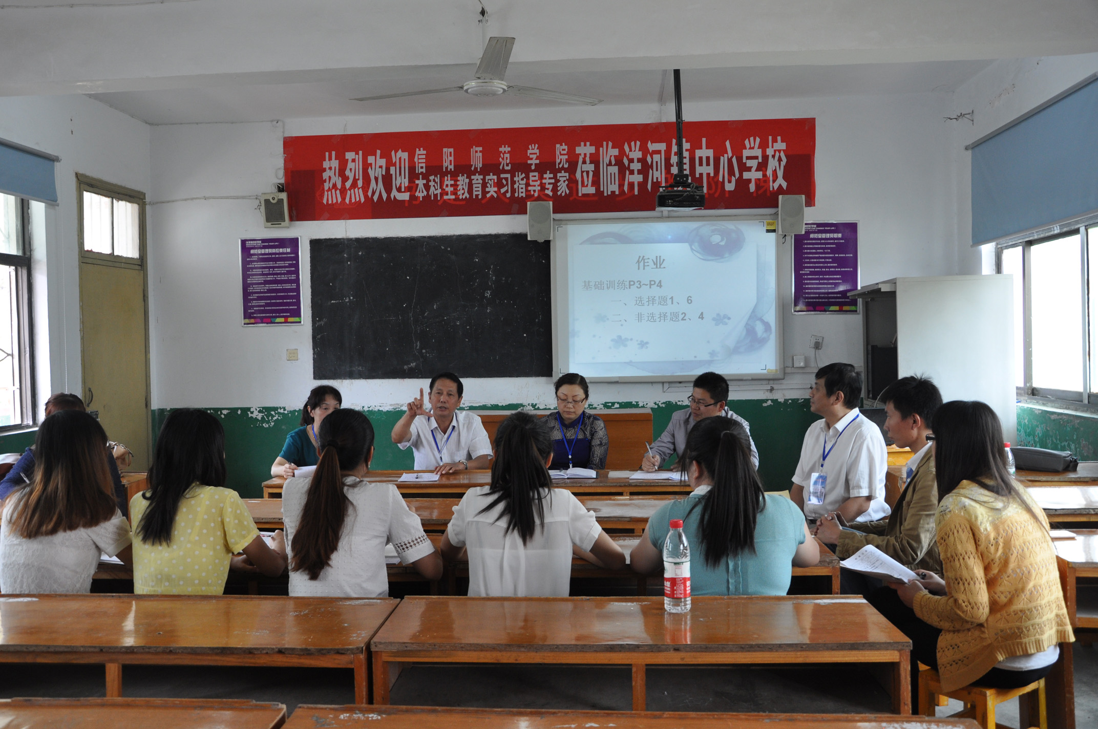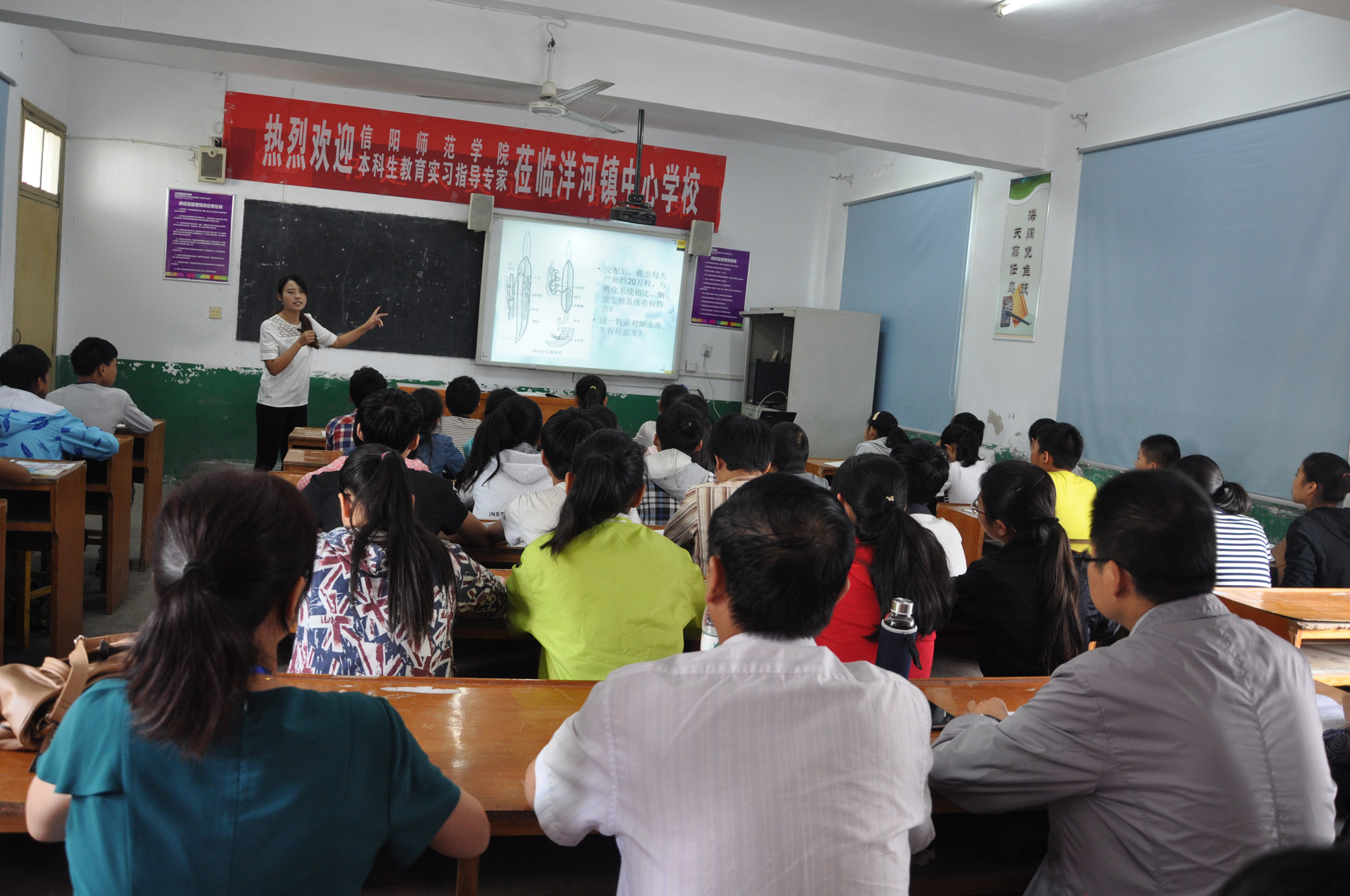 生科院教育实习督导组首先到达洋河中心学校,按照信阳师院统一安排有6个专业42名本科生在此进行教育实习。督导组走进教学楼内八年级(5班),听评了李恒莉同学讲授的人教版八年级上册第一章第二节《线形动物》。