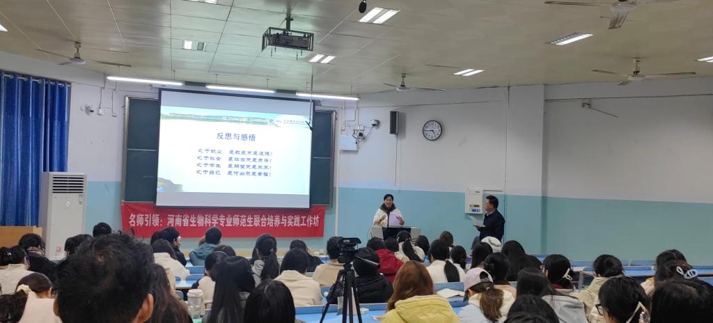 为进一步加强和完善我院河南省生物科学专业师范生成长工作坊的建设,11月24日,应工作坊的邀请,全国模范教师、信阳高级中学周竹老师在教九楼305教室作了题为《回首向来躬耕处——中学教师专业成长漫谈》的专题讲座。我院院长饶本强、教学秘书胡月及各工作坊学员参加了本次讲座。讲座由饶本强主持。