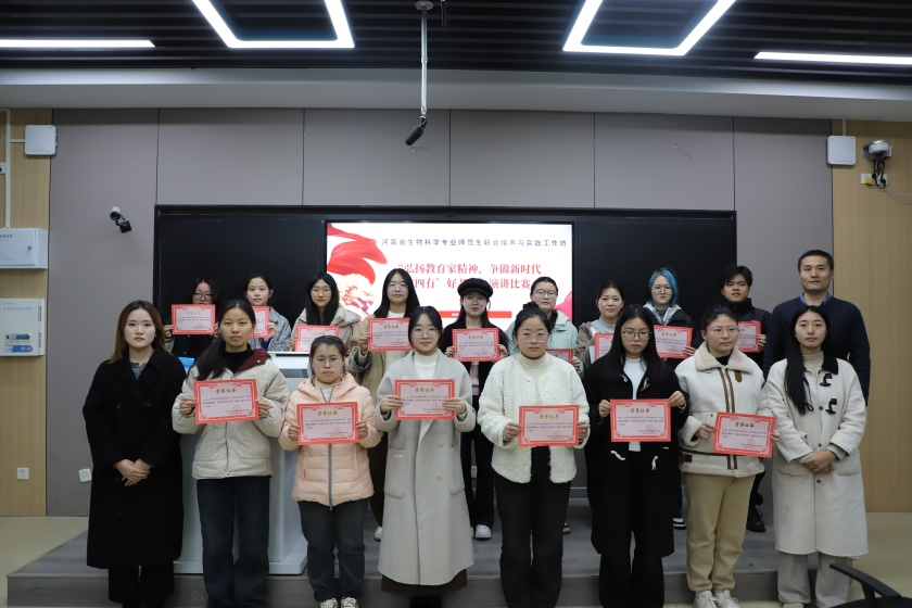 2024年12月1日,河南省生物科学专业师范生第六成长工作坊在教9-209成功举办了一场以“弘扬教育家精神,争做新时代四有好老师”为主题的演讲比赛。此次活动旨在提升师范生对教育家精神的深刻理解与感悟,进一步坚定其投身教育事业的信念与决心。