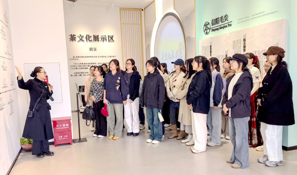 在信阳毛尖博物馆,师生们通过电子沙盘、全息成像、场景复原等现代展陈方式,系统学习了中国茶文化的历史脉络与信阳毛尖的独特工艺。随后,师生走进万亩标准化示范茶园、智慧茶园基地、传统手工炒茶坊与智能化生产车间,实地观察茶树生长状态,记录不同品种的形态特征,并听取张伟老师关于茶树品种选育、病虫害防治与茶园管理的讲解。