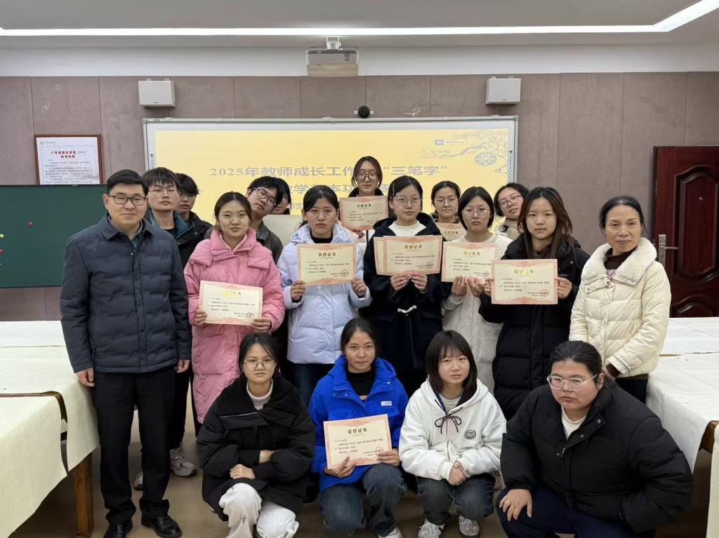 在随后举行的颁奖仪式上,获奖学子依次登台,从老师手中接过荣誉证书并与老师们合影留念,记录下专业技能成长的宝贵瞬间。我院师范生工作坊举办“三笔字”(粉笔、钢笔、毛笔)竞赛对于锤炼师范生的教学基本功,强化师范生职业素养,传承中华优秀传统文化以及增强师范生的职业使命感都具有十分重要的意义,并为他们的未来教学生涯奠定坚实基础。