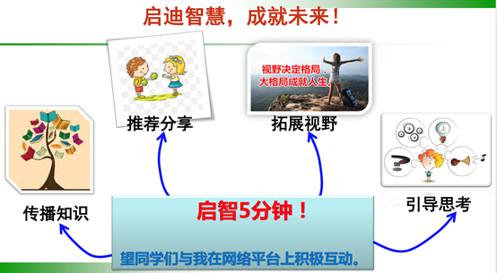 荆老师在直播课上以“启智五分钟”为形式,注入育人新元素,增强教书育人效果。在第一次课上,针对同学们在家里时间利用效果不佳现象,他专门教授了如何科学合理的进行时间管理,进而提高学生的学习效率,真正利用好网上课程资源,达到停课不停学的真实效果。荆老师利用课堂中的五分钟左右时间进行“启智五分钟”,以“启迪智慧,成就未来”为宗旨,认真准备每次选取一个关键词,对学生进行人生自我管理教育,从而使学生提高认识,并在现实中实践提升自我。