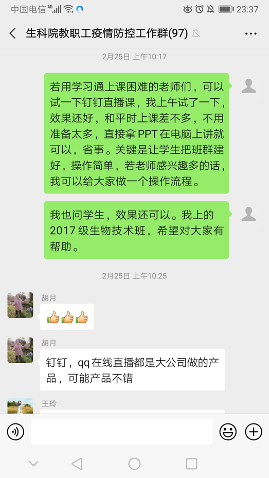 荆胜利老师是我院生物技术系系主任,线上教学开展以来,他多次尝试、探索不同的教学方式以寻求最佳的教学方式。为了更好的进行线上教学活动,荆老师尝试使用学习通、QQ直播、钉钉直播等授课平台,最终锁定使用钉钉直播进行疫情教学。为了预防线上课程出现教学故障,避免影响教学效果和学生的学习体验,荆老师提前建好钉钉上课群,并预约学生进行模拟课程,让学生尝试使用直播中的连麦功能,从而在直播过程中能够增加互动,实时了解学生掌握情况。学生普遍反馈,直播效果更佳,具有上课的仪式感,更具有线下上课的效果。因此,第一次直播后,荆老师在生科院微信群推荐更多老师使用钉钉软件进行网上教学,并指导本教研室的王玲和邢锋老师使用钉钉软件,提高疫情期间的教学效果。