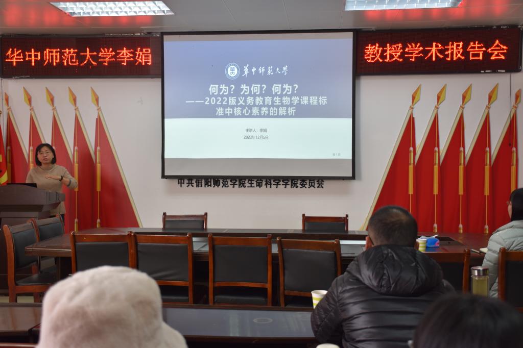 12月5日下午,应bevictor伟德官网邀请,华中师范大学bevictor伟德官网李娟副教授在生物楼412会议室做了题为“2022版义务教育生物学课程标准中核心素养的解析”的学术报告。报告会由我院彭波博士主持,学院副院长宋新强,部分教师及学科教学(生物)专业研究生聆听了报告。