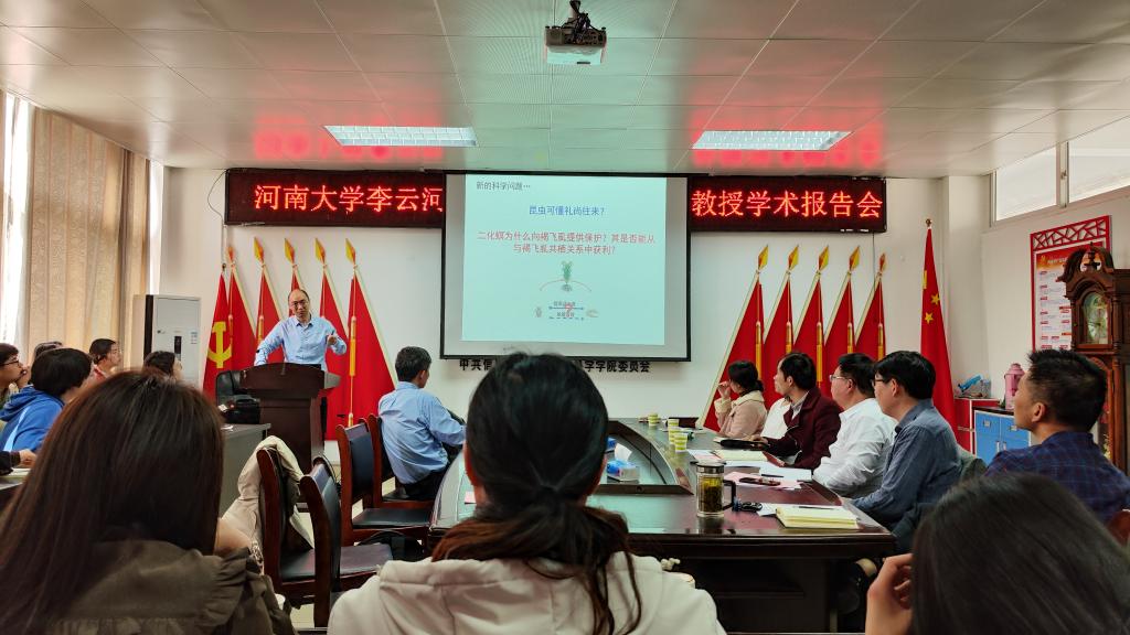 2023年3月9日上午,应bevictor伟德官网邀请,河南大学周树堂教授和李云河教授在生物楼412会议室,分别做了题为“昆虫高生殖力的遗传基础与分子调控机制解析”和“二化螟与褐飞虱协作应对水稻抗虫防御的生态和分子机制”的学术报告,我院青年教师及部分学生聆听了报告。报告会由院长饶本强教授主持。