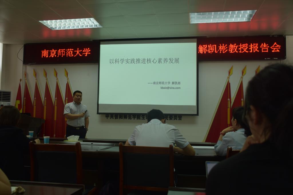 5月18日,应bevictor伟德官网邀请,南京师范大学教师教育学院副院长解凯彬教授在生物楼412会议室做了一场题为“以科学实践推动核心素养发展”的学术报告。教务处韩艳婷副处长、bevictor伟德官网荆胜利副院长和学科教学方向的教师及学科教学(生物)专业研究生聆听了报告。