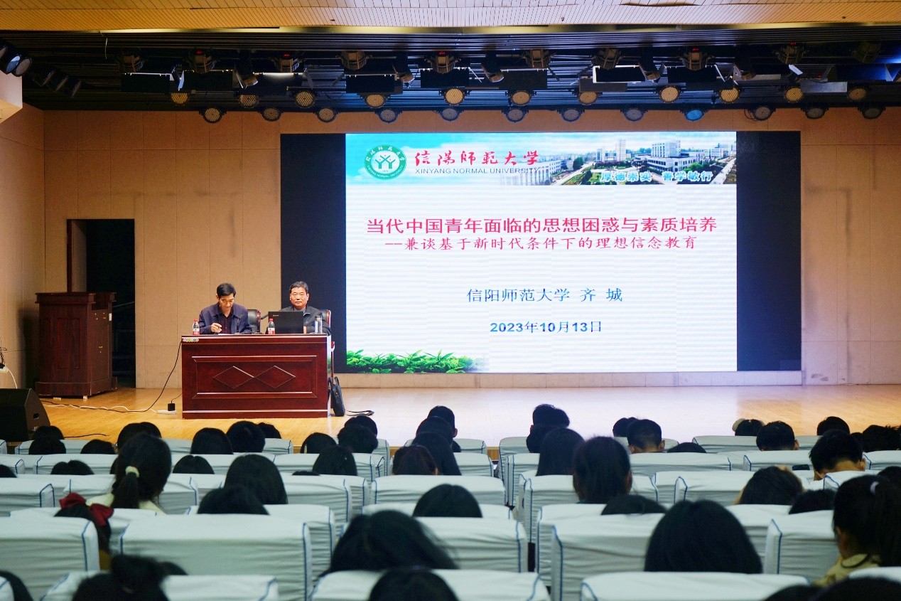 为帮助新生尽快适应大学生活,明确未来的目标与方向,树立新时代大学生该有的素质和本领。我院与物理电子工程学院于10月13日晚在理科楼报告厅召开了以“当代中国青年面临的思想困惑与素质培养——兼谈基于新时代条件下的理想信念教育”为主题的新生入学教育,此次报告由信阳师范大学原副校长齐城主讲,我院及物理电子工程学院2023级全体新生参加。