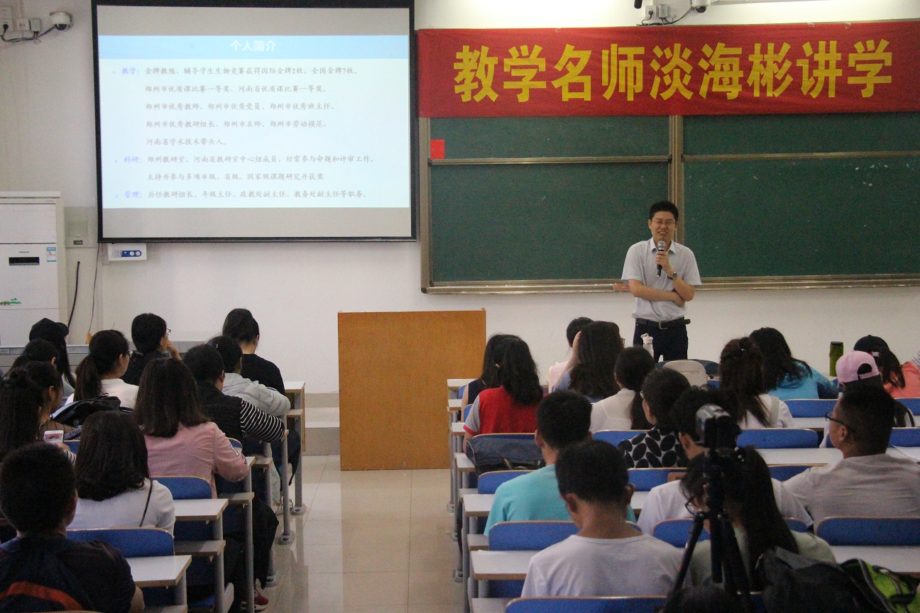 淡海彬,金牌教练,曾辅导学生生物竞赛获得国际金牌,获得郑州市优质课比赛一等奖、河南省优质课比赛一等奖,郑州市高考研究中心中心组成员、河南省教育教学研究室高中教学研究中心中心组成员,参与命题和审评工作,并多次参与市级、省级、国家级课题研究并获得奖项。