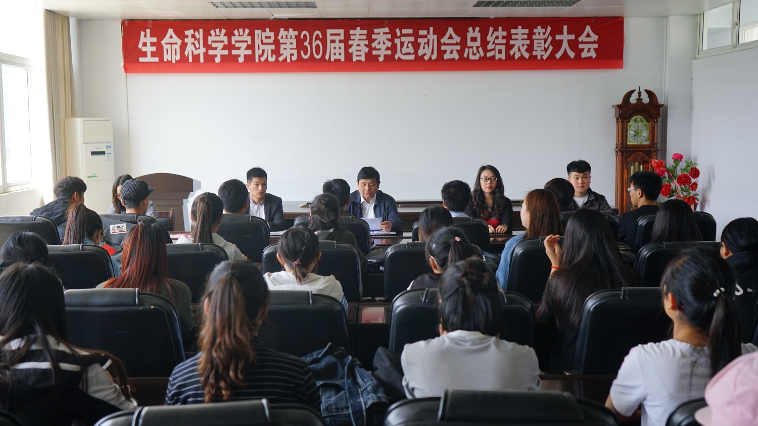 为鼓励运动会期间表现突出的个人和团体。4月27日中午,我院在生物楼412会议室成功召开第36届春季运动会表彰大会。院党委副书记杨霁虹,团委书记孙太红,团委老师熊蕾及40余位受表彰者共同参加了本次表彰大会。会议由孙太红主持。