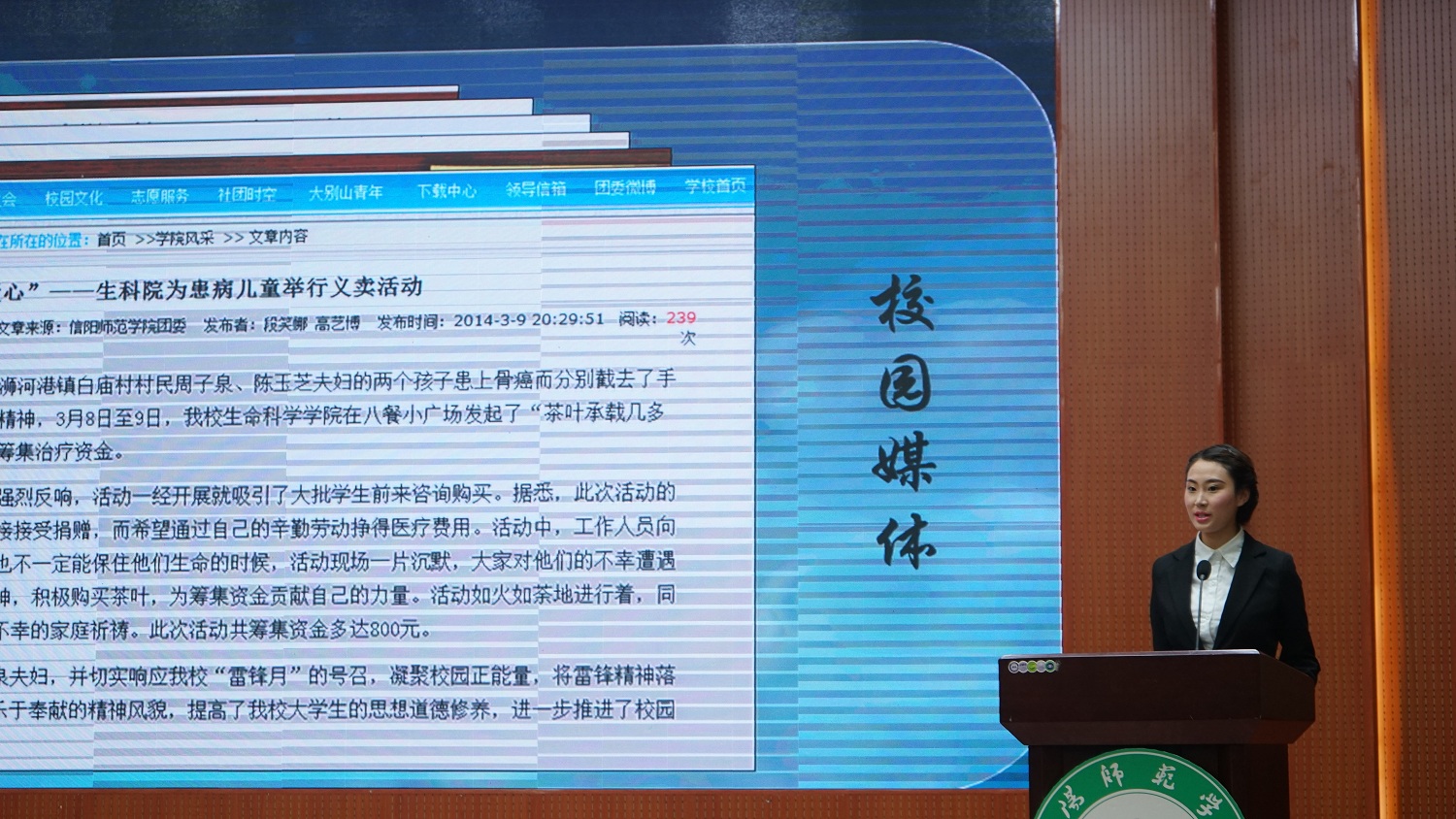 4月27日晚,我校第二十届“校园明星”评选活动在逸夫楼多功能厅举行。校团委副书记朱国朋及相关学院党委副书记等领导老师出席现场并担任评委,与500余名学子共同参加评选活动。来自全校各学院20名优秀学子参与了最终评选,我院2013级生物科学1班韩露获得入围奖。