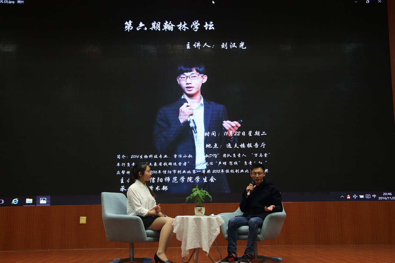11月22日,由校学生会主办的翰林学坛之创业有路我心为梦大型公益讲座在逸夫楼报告厅举行。我院学子刘汉光做客翰林学坛,为大家分享了他的创业路。