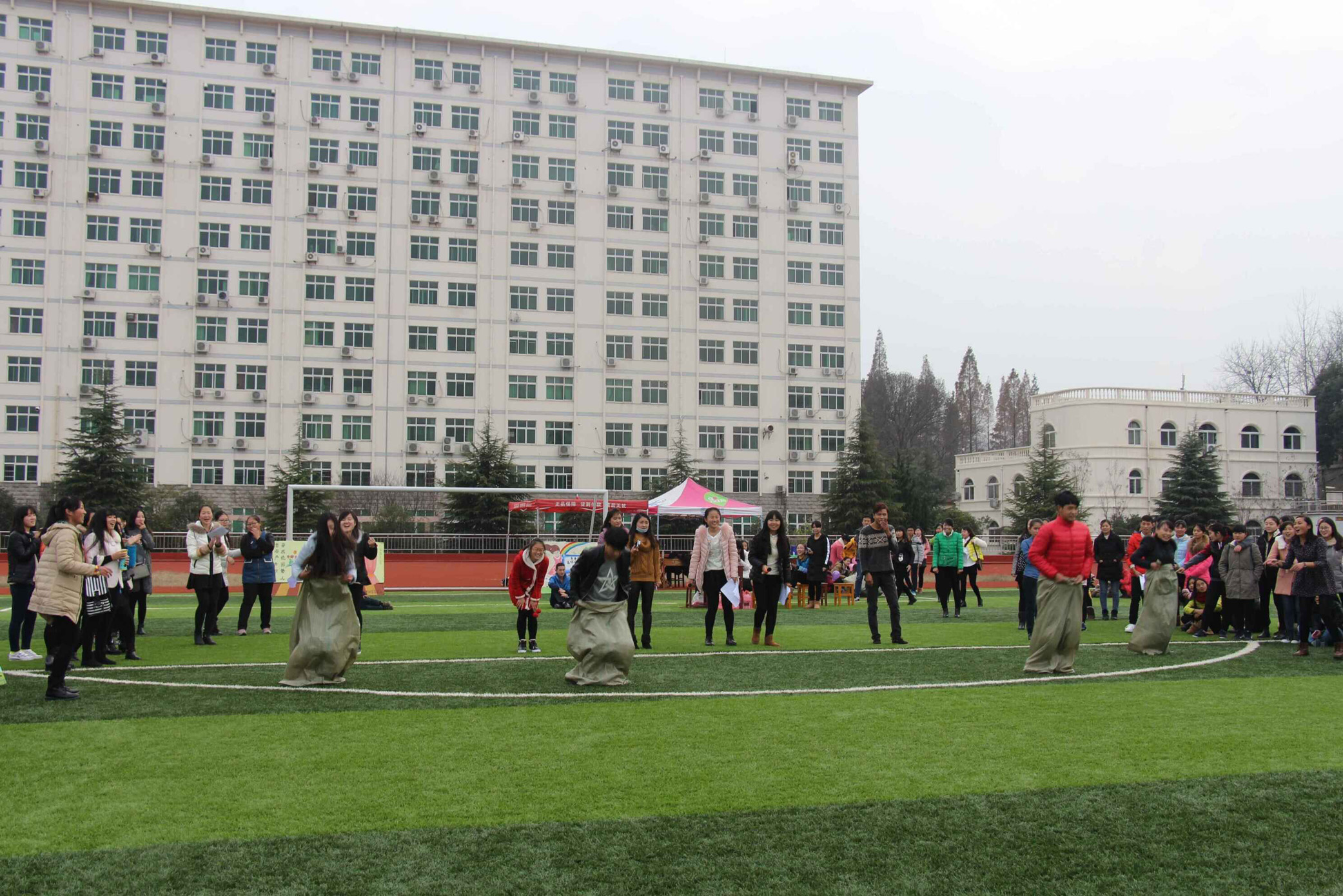 活动以游戏的形式开场,由负责人讲解完游戏规则后,游戏正式开始。袋鼠跳接力赛这一经典游戏一开始就迅速点燃了现场的气氛,同学们一个个都奋力直追,场面异常激烈,场外同学们加油呐喊声更是此起彼伏。螃蟹运球游戏中,考验的是两个同学的默契度,他们需要用背夹着气球走到终点,并且保证气球不掉,滑稽的运球动作引来现场同学们的一阵阵笑声,在蓝天白云、青草坪的映衬下,更加悦耳动听。游戏大风吹、各位好汉请抱拳、踩报纸、抢凳子等,也都深受同学们的喜爱。在游戏之余,同学们也都积极表现自己,由他们带来的歌曲演唱,小品等更是把现场气氛推向了高潮,活动在同学们的欢声笑语中结束。