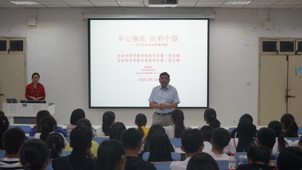 9月26号,我院学生第一党支部、学生第二党支部全体党员和发展对象,在党支部书记熊蕾、杨娟娟的带领下,齐集生物楼414教室,邀请学院党委副书记杨霁虹开讲《牢记嘱托出彩中原——习近平总书记考察河南》。