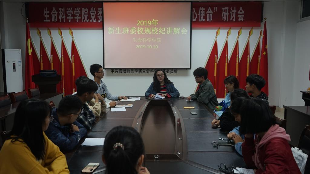10月10号,我院于生物楼412会议室召开2019年新生班委校规校纪讲解会。我院团委书记熊蕾与2019级各班班长及团支书共同参加此次会议,会议由熊蕾主持。