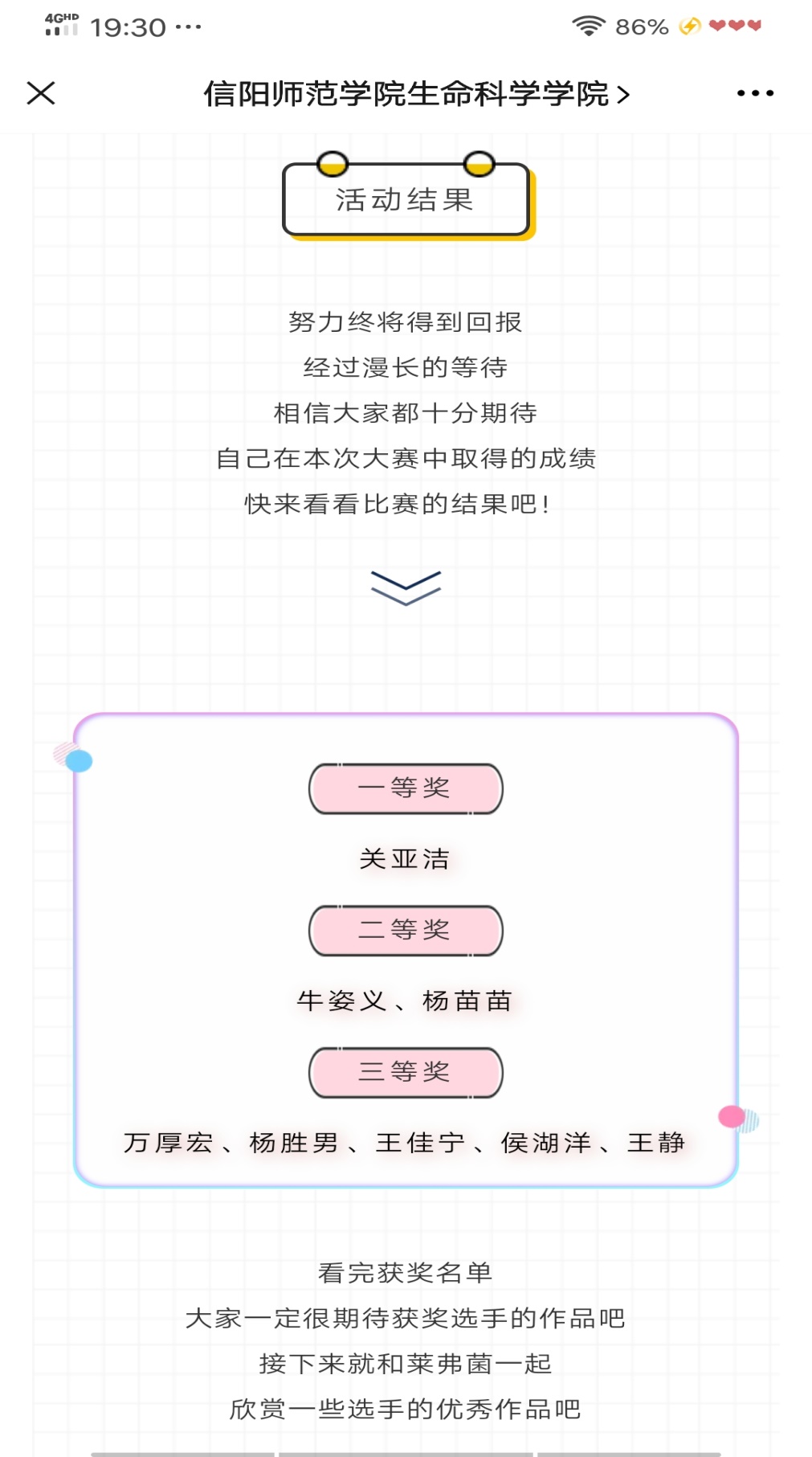 此次活动要求参赛者以“诚信”为主题,观看相关视频,以书面形式表达自我真实感悟,同时在活动中提高政治思想觉悟,牢固“诚信乃立人之本”观念。参赛选手全力以赴对待本次活动,呈现高质量、独特见解的文章,助力活动完美落幕。经过激烈的评选角逐,关亚洁、张帆荣获一等奖;牛姿义、杨苗苗、魏毓彤等人荣获二等奖;万厚宏、杨胜男、王佳宁、侯湖洋、王静、等人荣获三等奖。