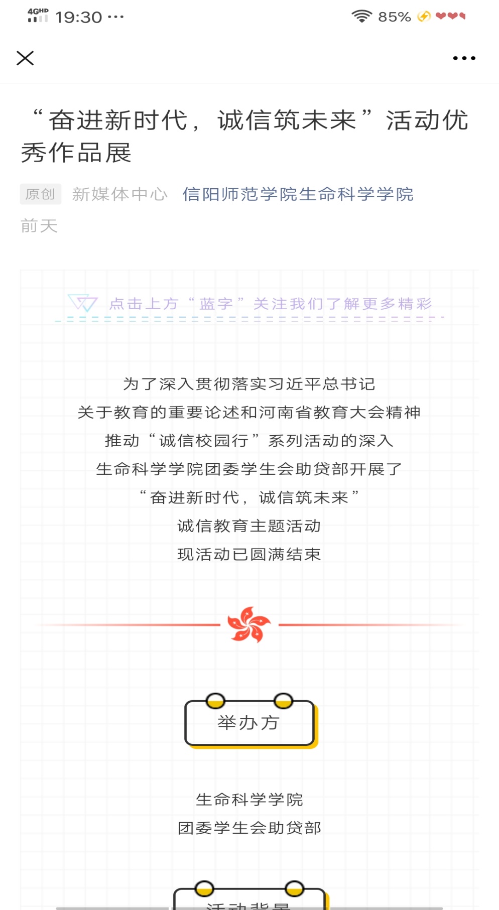 为提高当代大学生对诚信品质的重视程度,深化诚信意识,我院学生会助贷部在疫情期间举办了“奋进新时代,诚信筑未来”、“诚信建设万里行”等线上活动。活动开展期间,我院百余名学子积极踊跃参与。