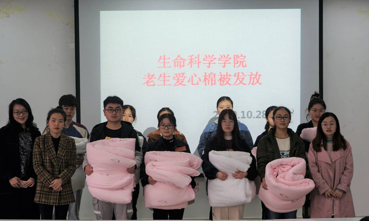 活动伊始,领导老师们向学子表达了诚挚的关心和慰问,叮嘱他们注意保暖,并表示希望受助的学子不负期望,艰苦奋斗,做一名优秀的大学生。随后,熊蕾、朱晓雯和杨娟娟为受助学子一一发放棉被,学子们纷纷表达感恩之情。