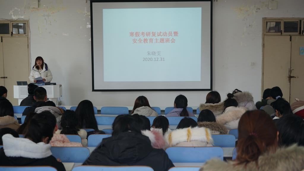 为鼓励我院2017级考研学子积极备战复试,同时增强其假期安全防范意识,12月31日中午十二点,我院于生物楼414多媒体教室召开寒假考研复试动员暨安全教育主题班会,2017级生物科学二班、生物技术班、茶学班辅导员朱晓雯参加并主持此次会议。