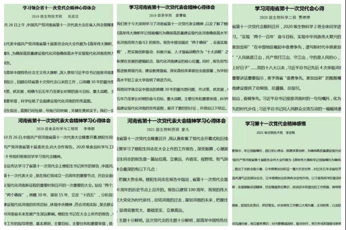 学习期间,同学们纷纷畅谈感悟。省第十一次党代会充分彰显了河南胸怀“两个大局”的使命担当,科学绘制了新时代河南出彩蓝图。新时代号角已经吹响,新青年的我们要立足主责主业,自觉聚焦中心大局,坚持以习近平新时代中国特色社会主义思想为指引,树牢“四个意识”,坚定“四个自信”,坚决做到“两个维护”,勇于担当作为,以求真务实的作风把党中央、省委及校党委决策部署落到实处,不断提升自己的政治修养和态度,力争优秀,勇创先进,不负党、国家和人民的期望!