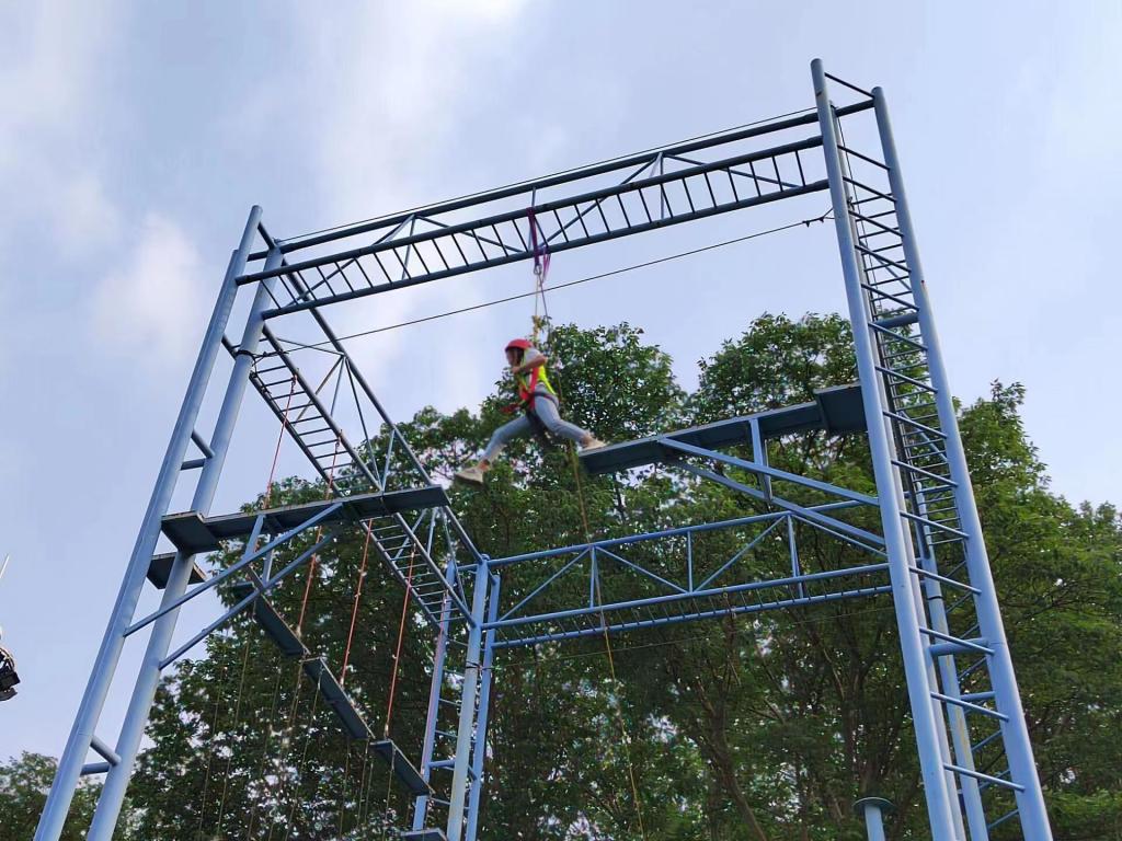 活动准备阶段,朱晓雯向同学们介绍了高空断桥、高空抓杠、合力制胜、巨人梯、模拟电网等游戏项目,讲述相关游戏规则以及活动中需要注意的事项,她强调要做好自身防护安全,保护自身安全,并在组织者的带领下进行游戏。随后,组织人员对同学们进行了分组。在“巨人梯“游戏中,两人一组共同协作往上攀爬,增强了队友之间的信任感,培养了团队合作精神和协调能力。“高空断桥”游戏中,学生需在指导下,通过起步、跨越、落地等动作完成断桥挑战,开发个人潜能,培养了自我挑战、自我突破的精神和能力;“合力制胜”游戏中,学生需站在钢板上保持平衡,依靠地下人员拉动绳子使其踏板前进,到达彼岸;“模拟电网”游戏中,同学们之间积极讨论,各抒己见,寻求过电网的最佳方法,充分锻炼了同学们的团队协作和组织能力。在各个游戏项目中,同学们齐心协力、密切配合、相互配合,展现了当代大学生的团队合作精神和协调能力。