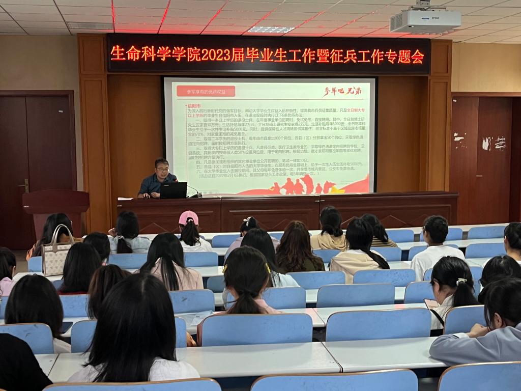 为深入学习贯彻党的二十大精神,全面落实全国、全省普通高校毕业生就业创业工作网络视频会议精神,做到毕业生文明离校,扎实推荐征兵工作,5月23日下午,我院在生科楼414召开2023届毕业生暨征兵工作专题会,学院党委副书记荣宪举、专职辅导员、2023届毕业生参加了会议,会议由院党委副书记荣宪举主持。