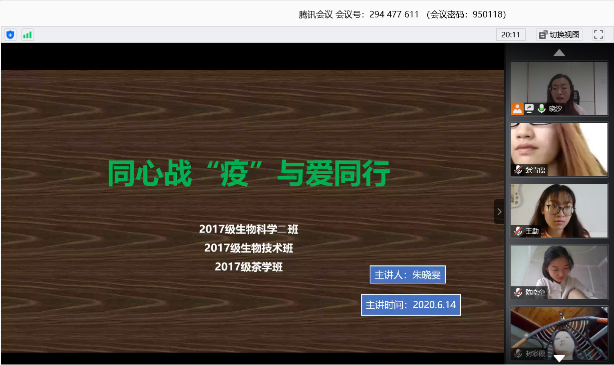 为弘扬爱国主义精神,加强疫情防控期间学子们的思想教育和价值引领,保障网上教学顺利进行,坚定学子们考研信念。614日下午,我院2017级生物科学二班、2017级生物技术班、2017级茶学班开展“同心战‘疫’,与爱同行”线上主题班会。班会由专职辅导员朱晓雯主持。
