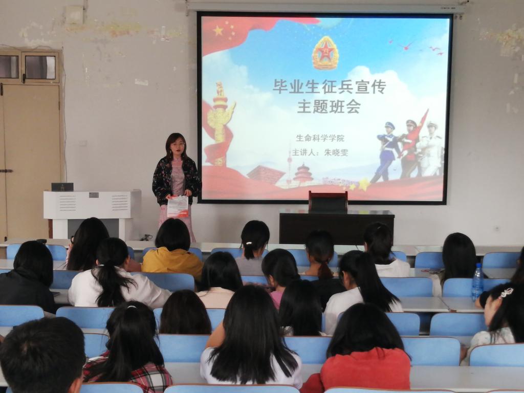 为培养学生爱国情怀,加强征兵政策宣传。518日,我院于生物楼414多媒体教室召开毕业生征兵宣传主题班会。会议由我院武装干事朱晓雯主持,2021届毕业生参加此次会议。
