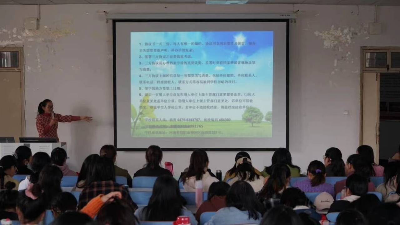 此次会议旨在为学子讲解三方协议作用与意义,引导学子严谨正确地填写,提醒在场学子慎重考虑协议内容,妥善保管相关证件。该会议有利于为学子树立正确的协议认知,防止部分毕业生陷入欺诈陷阱,对我院学子顺利毕业打下坚厚基础。