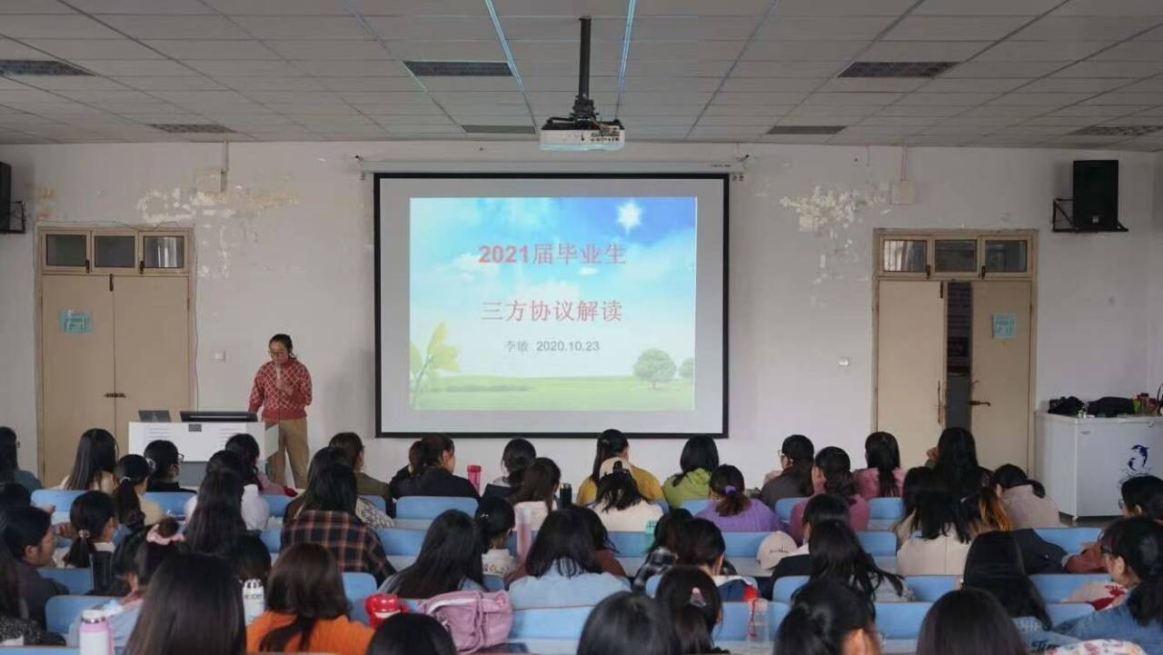 为确保学子顺利、正确签订协议,全面了解协议内容与含义。10月23日,我院于生科楼414多媒体教室召开“2021届毕业生三方协议解读”会议,会议由专职辅导员李敏主持,2021届bevictor伟德官网全体毕业生共同参与。