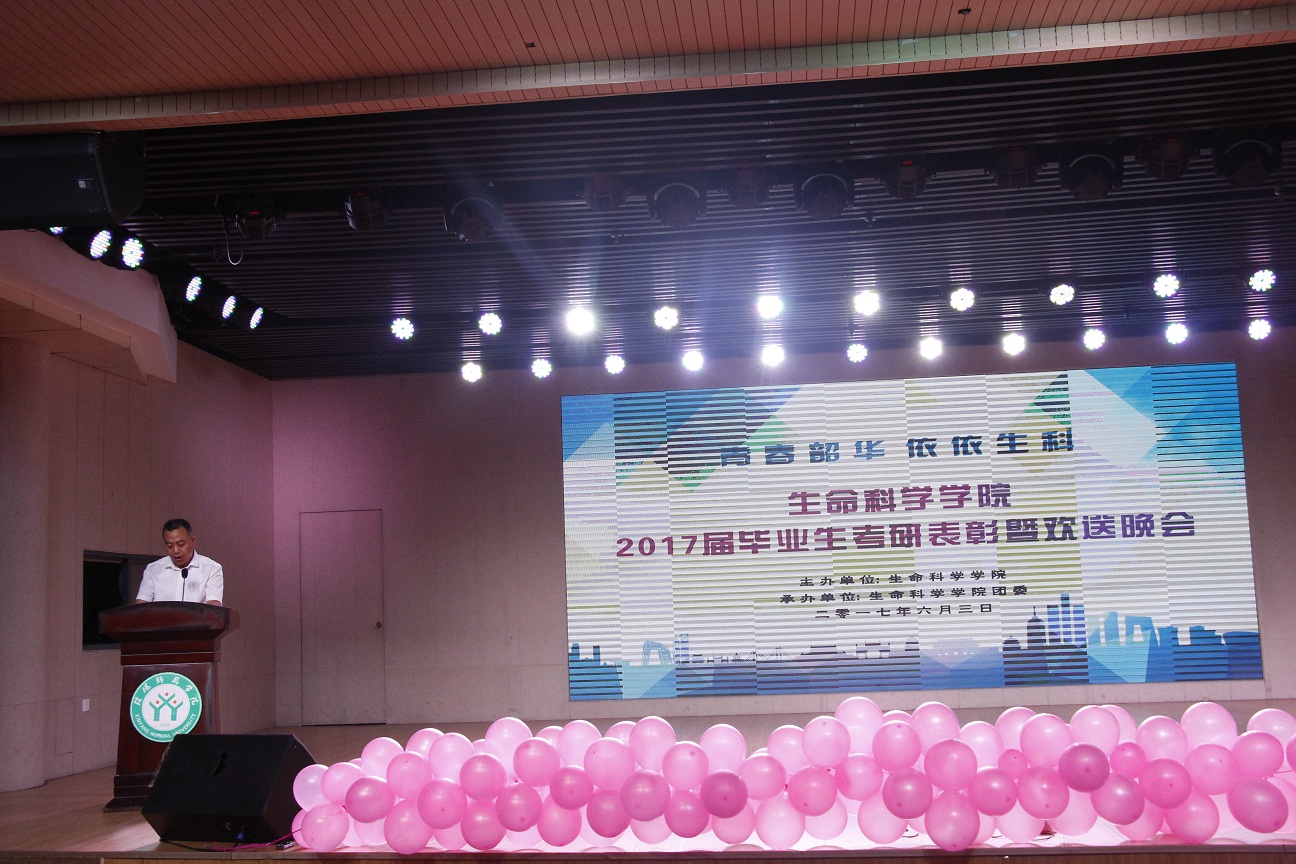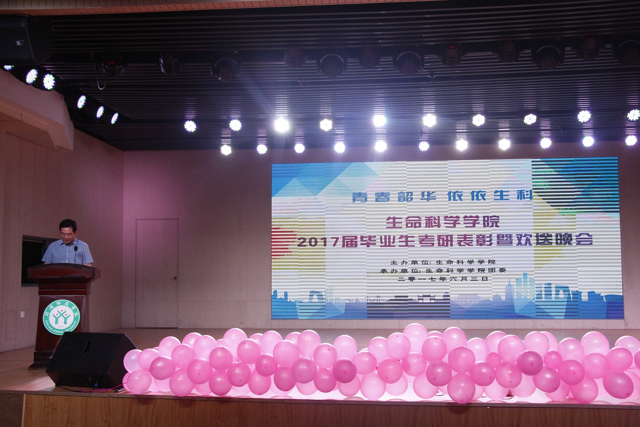青春韶华,依依生科。6月3日晚,我院2017届毕业生考研表彰暨欢送晚会在理科楼报告厅隆重举办。院党委书记李向阳、院长袁红雨,党委副书记杨霁虹、副院长宋新强、遗传研究所副所长马云、副院长张海宾、遗传研究所副所长饶本强,院长助理徐永杰及校团委创新实践部部长许霏等领导老师出席并与500余名学子共同观看了晚会。