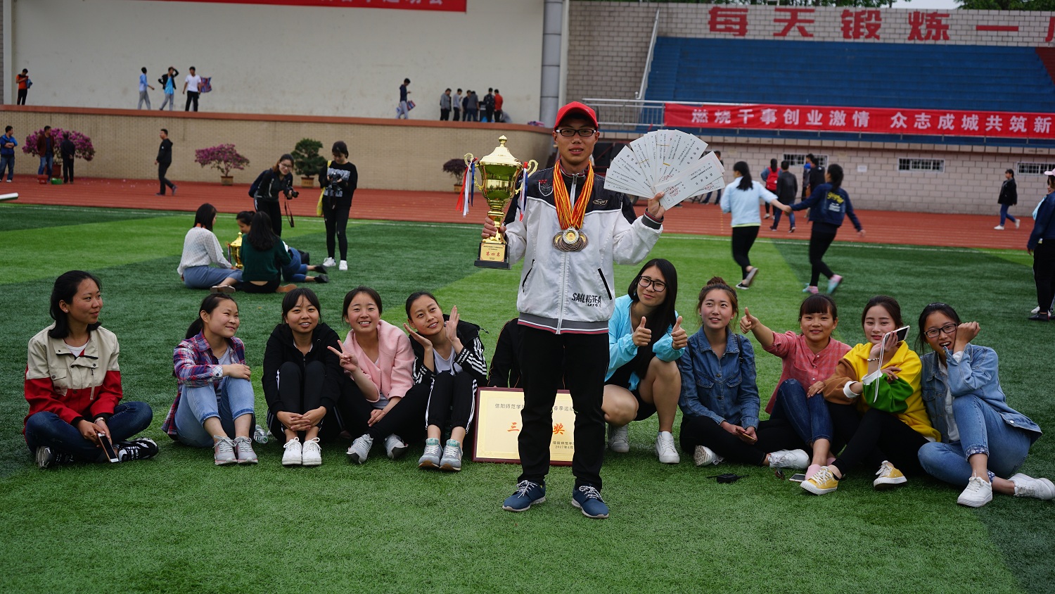 副校长陈登报为女子甲组铅球获奖选手颁奖。