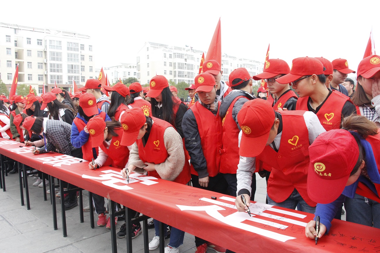 3月3日上午,我院组织学生前往平桥区世纪广场参加全市青年志愿者学雷锋主题活动月启动仪式,并在活动条幅上签名。