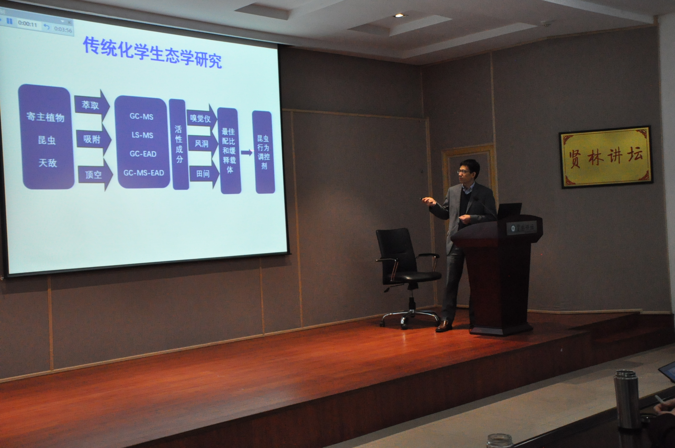 王桂荣研究员首先深入浅出地介绍了嗅觉在调控昆虫行为的关键作用,并提出了以昆虫嗅觉识别机制为基础的反向化学生态学研究方法和理论。然后以蚜虫报警信息素识别机制为例,详细讲述了如何采用反向化学生态学研究思想解决科学问题。最后,在反向化学生态学研究基础上,提出了害虫“推-拉/干扰交配”防治新策略。刘文德研究员首先介绍了稻瘟病对粮食生产危害,然后详细讲解了分生孢子萌发、释放孢子粘液、形成芽管 、产生附着胞、侵染钉刺入、侵染菌丝生长六个病菌侵染循环过程,在此基础上提出了稻瘟病菌与水稻互作分子机理的四个重点研究方向,并重点阐述了这四个方向的研究进展。李云河研究员首先对转基因作物对农田生态系统影响进行了介绍,然后以转Bt水稻为例,从转Bt水稻对非靶标生物的非靶标影响与昆虫行为及种间关系的调控机制两大方面进行详细阐释。他们研究团队进过多年转基因水稻的非靶标效应评价研究,在国际上首次提出了可用于转基因水稻非靶标效应评价的节肢动物指示种。最后,三位专家讲述了自己的教育科研经历,并勉励同学们要勤奋、自信、执着,做最优秀的自己。在互动环节,三位专家与师生们在专业学习和科学研究等方面进行了热烈讨论。