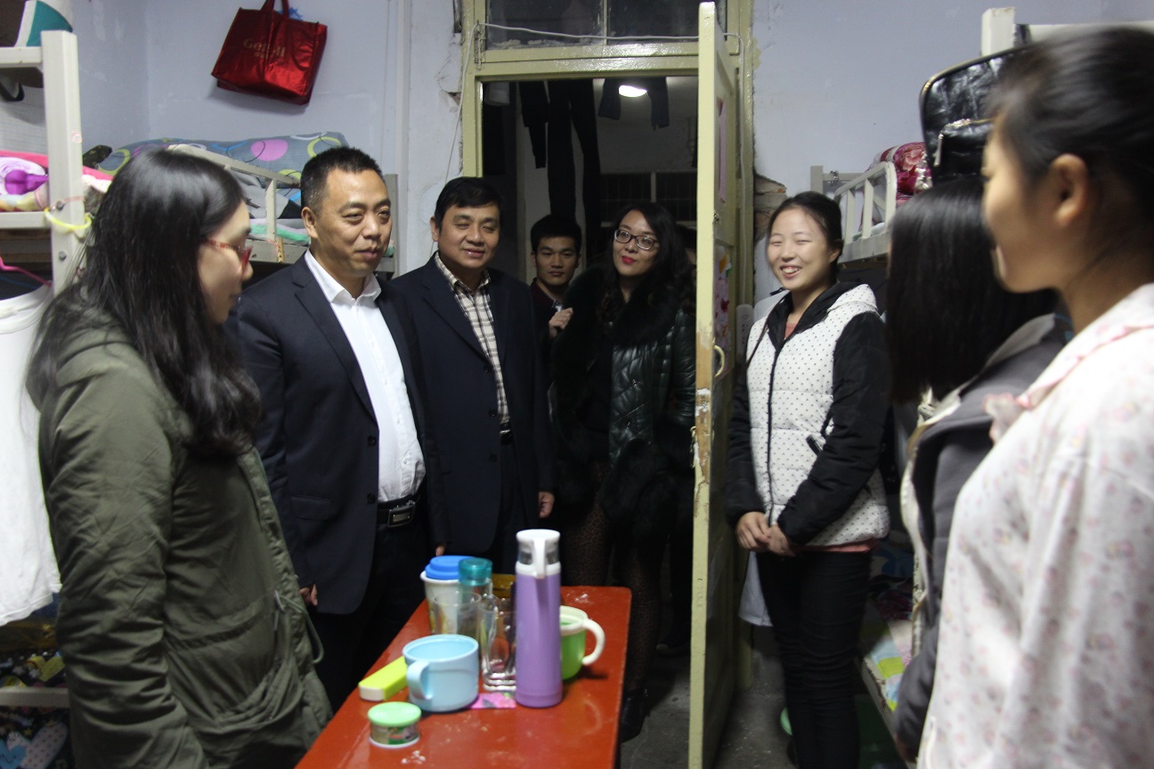 领导老师们的到来受到了同学们的热烈欢迎。一行人首先来到了新生宿舍,李向阳仔细询问了新生们的学习情况、生活情况和课外活动情况,寝室长介绍了同学们家庭和家乡以及到校适应情况,尤其是基于高中阶段学习现状,对专业学习的设想,李向阳指示随行班主任要更加关心省外生源同学的生活,看到每个宿舍张贴的心理健康文明标语和彩绘,他鼓励同学们更加积极的参与学校校园文化的各类活动,锻炼自己的能力。李向阳着重强调了宿舍安全问题,尤其是隐患重于明火,要加强宿舍用电管理,强化安全防范意识,确保每一个同学“安全无小事”入心入脑。一行人又来到了大四、大三、大二学子的宿舍,李向阳从专业知识、人文知识,到考研技巧,再到人生理想,与同学们亲密交流、侃侃而谈,提出了切实的合理建议,缓冲了学生的考研压力。