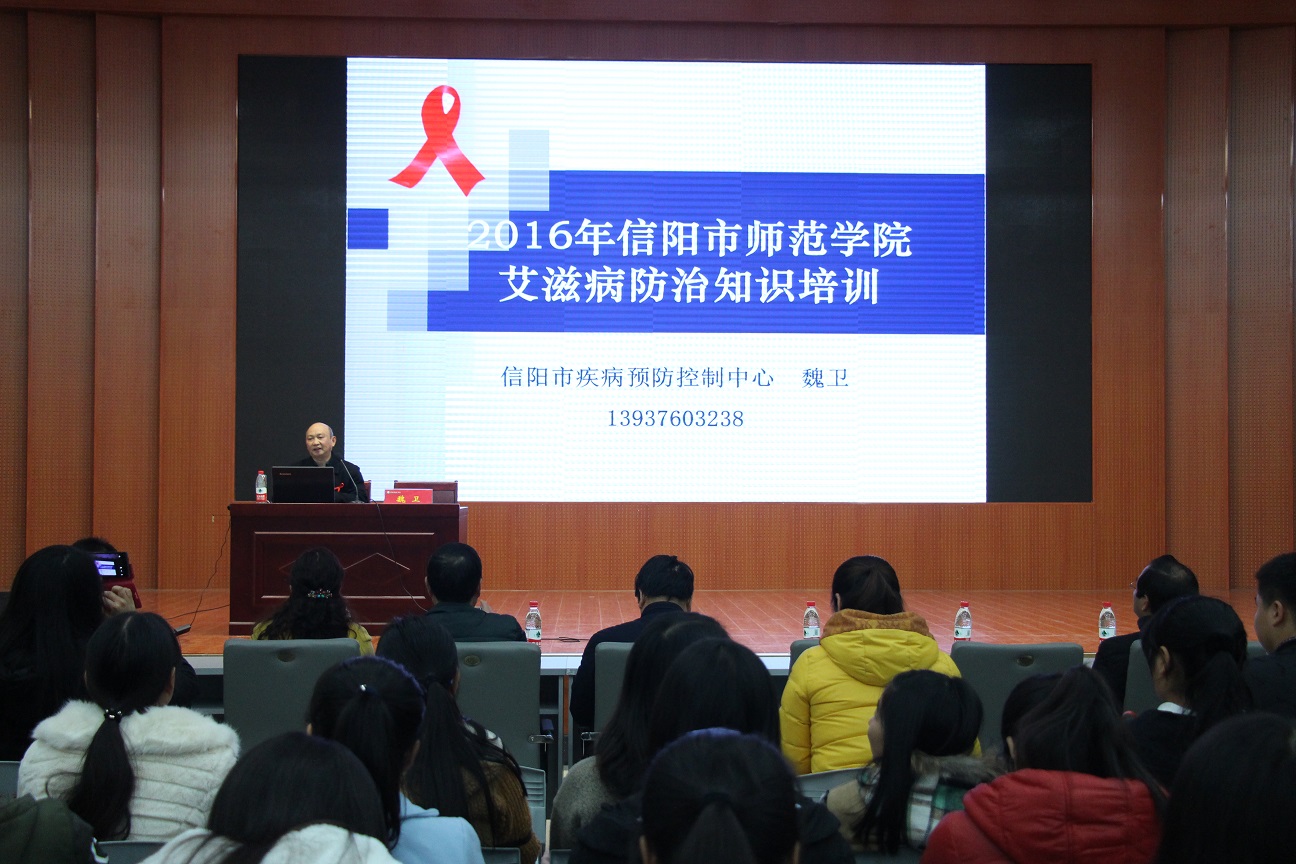 12月1日,信阳市疾病中心防艾科科长魏卫在逸夫楼多功能厅为我校师生作了艾滋病防治知识讲座。信阳市红十字会秘书长张孔华,校团委书记王建旭,信阳市相关单位、校医院、我院相关负责同志以及全校师生代表共400余人参加了活动。讲座由我院党委副书记杨霁虹主持。