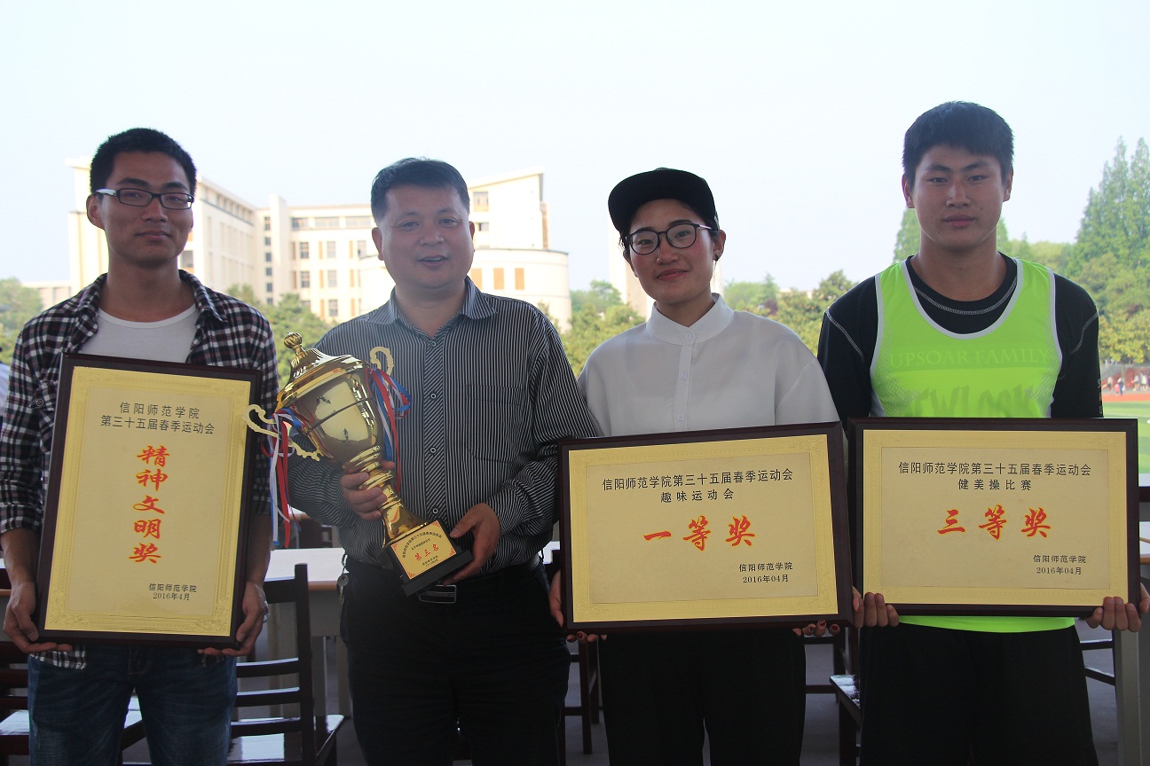 在院领导老师的关怀带领,运动员的努力拼搏下,我院获得信阳师范学院第35届春季运动会精神文明奖、女子甲组团体总分第三名、趣味运动会一等奖、健美操三等奖的喜人成绩。