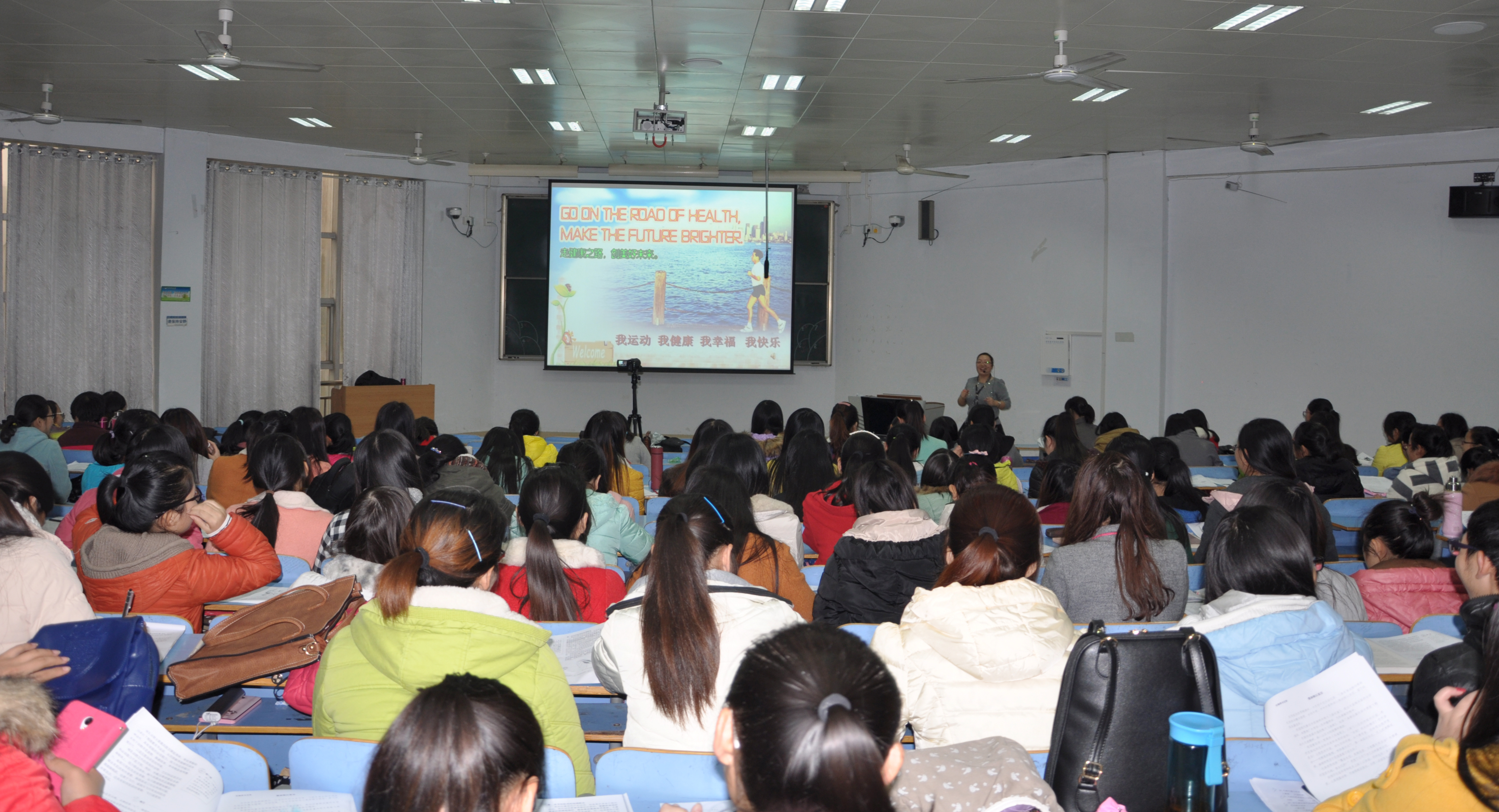 近170个座位的生物楼413教室座无虚席,18日我校生物科学专业本科生和其他教师教育专业部分本科生,聆听了中学名师魏虹娣老师以趣味游戏开场、以班级学习小组为主体、以间隔的图片或微视频为素材、以人体关节为实例导入人教版初中生物教材《动物的运动》一节,图文并茂的对骨、关节、肌肉为知识点的教学内容进行巩固、拓展,以小组提问或教师设问来完成课堂作业,整堂课结束时流畅的引导出健康格言――“每天锻炼一小时,健康工作五十年,幸福生活一辈子”的科学依据。
