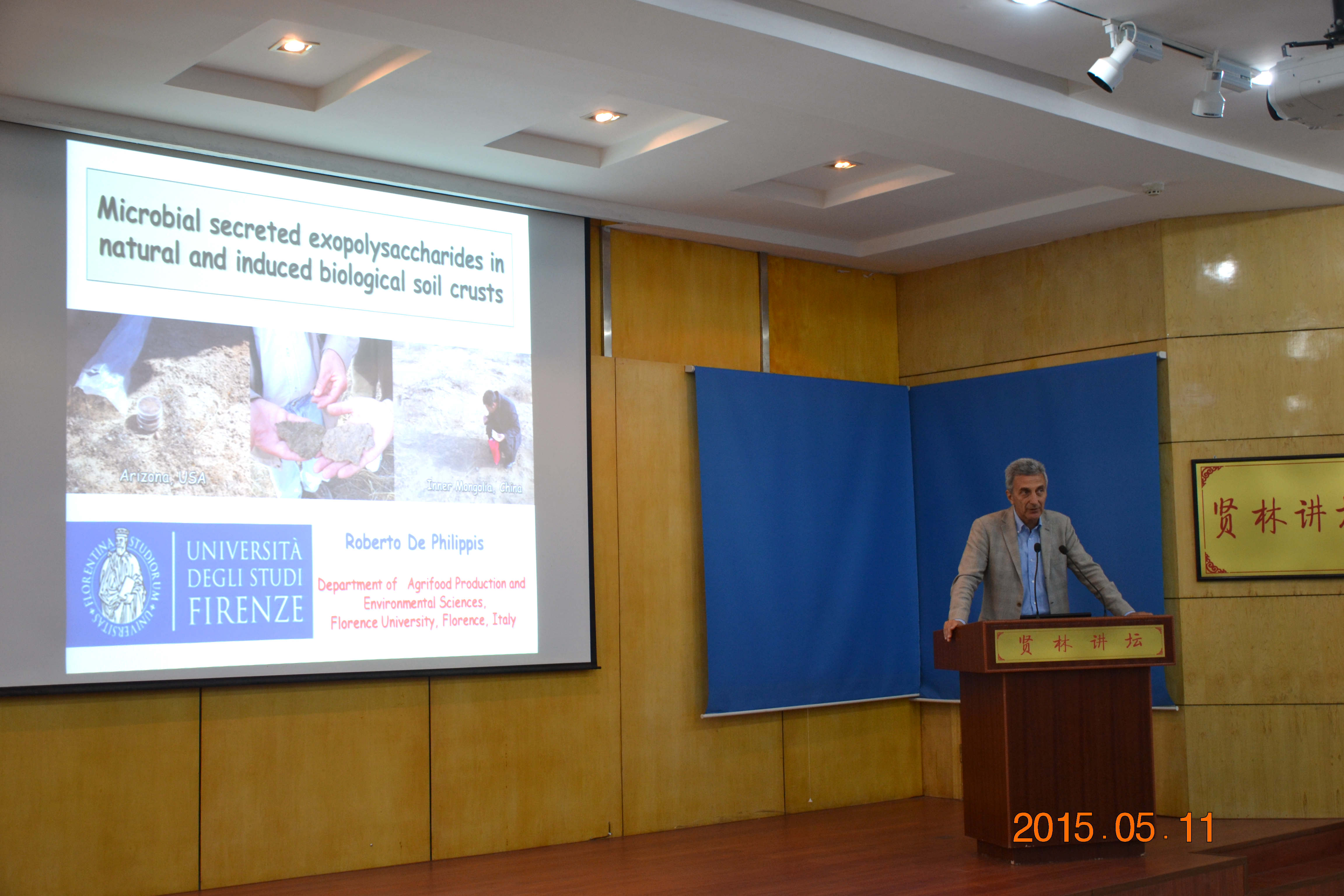 两位专家访问我校期间,在贤林讲坛分别做了题为“整合-藻类生物学发展的途径”和“Microbial secreted exopolysaccharides in natural and induced biological soil crusts”的学术报告。在报告中,刘永定教授对藻类的异质性、生态性和可应用性进行了详细阐明,并针对自己科研团队近年来结合国家需求和科学需求,在藻类水华防治、藻类在荒漠化治理中的应用以及藻类在载人航天中的应用进行了深入解读。De Philippis教授在报告中对微生物分泌多糖的类型、结构、生态学功能以及藻类多糖在诱导生物结皮形成等方面作了系统而深入的阐述。来访期间,De Philippis教授和刘永定教授参观了bevictor伟德官网蛋白质组学平台、植物基因资源发掘与病虫害控制实验室、分子遗传实验室和藻类环境生物学实验室,并与生科院青年教师分享了如何实现科学理想、获得学术成就的体会以及国家自然科学基金申报的经验。在访问期间,De Philippis教授和刘永定教授还实地考察了信阳南湾水库水质状况和鸡公山自然保护区土壤藻类生态环境。