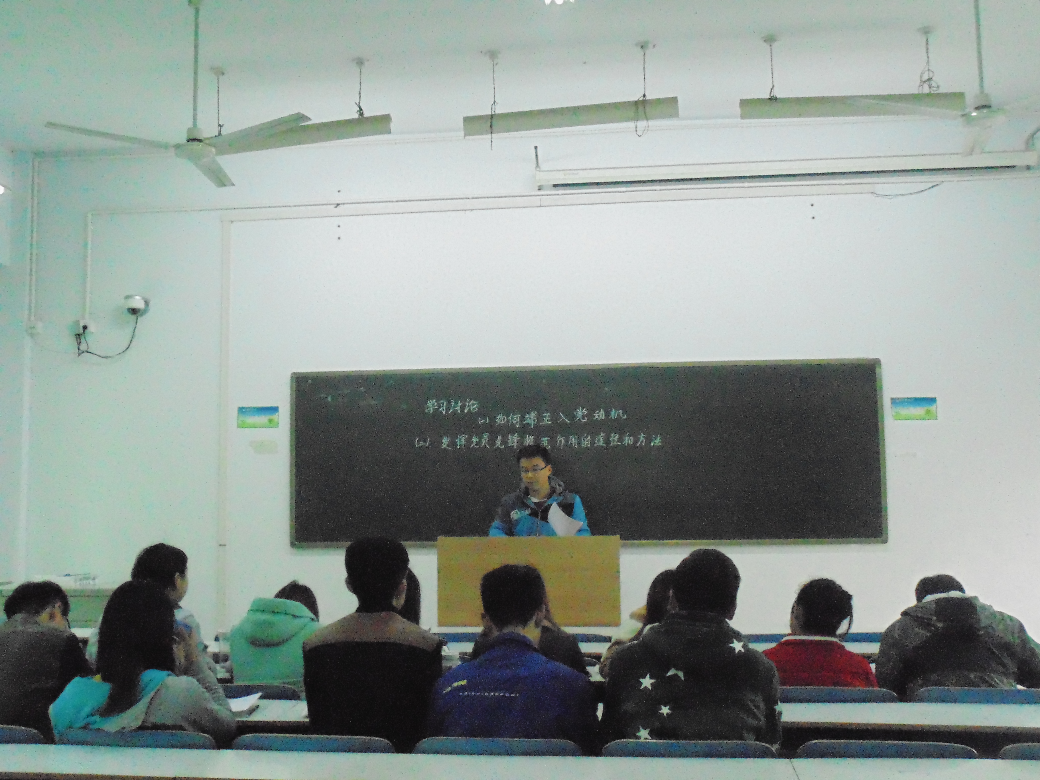 讨论课上,首先以小组为单位,紧紧围绕“如何端正入党动机”、“发挥党员先锋模范作用的途径和方法 ”这一主题展开积极热烈的讨论。大家畅所欲言,现场气氛活跃。经过激烈讨论,每组学生代表纷纷主动上台发表了自己对如何做一名合格的共产党员以及发挥党员先锋模范带头作用的认识与理解。第一,大学生应以学习为主,在学好自己专业知识的同时,要以工作促进学习,用学习指导工作,严于律己,提高自身理论水平和文化修养;第二,大学生要把政治道德的培养放在首位,坚定社会主义信念,积极踊跃参加社会实践活动,用理论指导实践,在学习、生活中发挥模范带头作用。最后,小组组长李玉震对此次小组讨论会做了总结,并强调,小组组员要摆正思想,积极向党组织靠拢,争取早日在思想上、组织上加入到党的行列中。