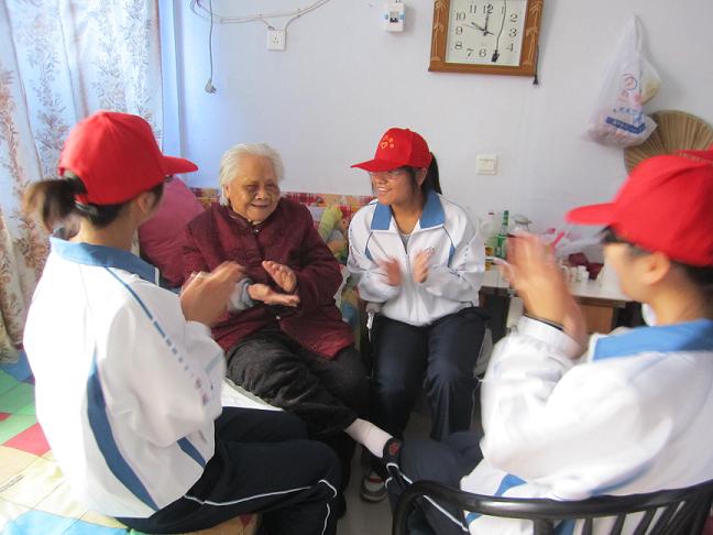 在老人公寓里,青年志愿者们纷纷与那些因行动不便无法观看表演的老人们唠家常,对他们嘘寒问暖。有的同学还不时的为老人捶背、捏腿。其中一个老奶奶突然问道:“现在是几月啊?”,这个问题让在场的志愿者们瞬间红了眼眶,大家在难过的同时,也更加坚定了关心老人们的决心。为了让这些没有看到节目的老人们开心,参加演出的志愿者们又不约而同地来到公寓,再次进行表演。她们为老人们唱歌、跳舞、唱京剧・・・・・・赢得了老人们的阵阵掌声,有位老奶奶高兴得笑不拢嘴,直嚷着让志愿者们在表演几个节目。一时间,房间里温馨极了。