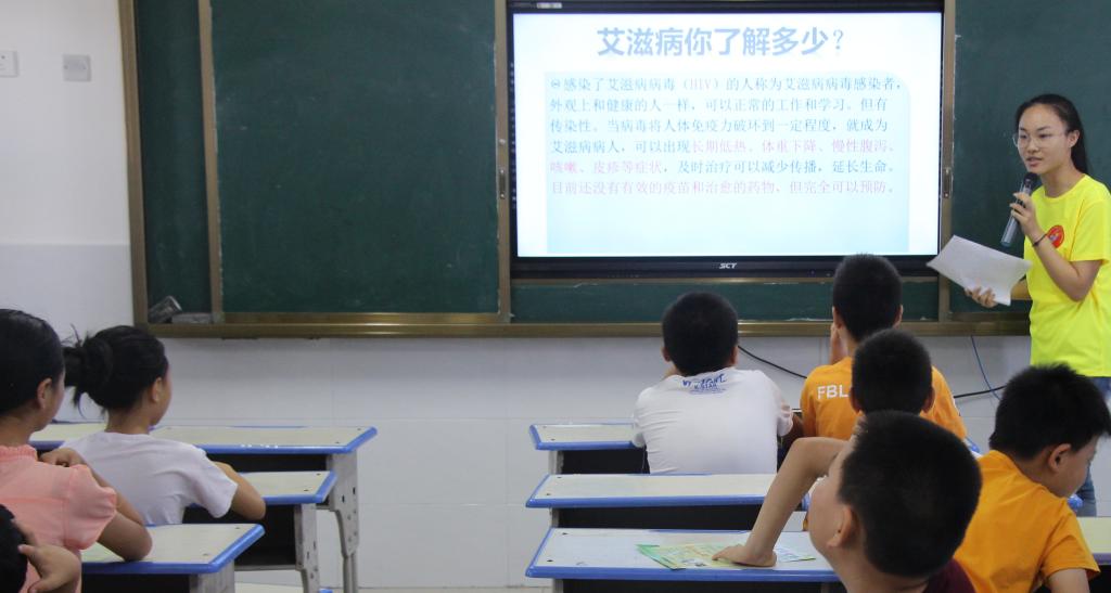宣讲团成员来到教室后,给在座的家长和同学发放的有关艾滋病知识的宣传手册。生命科技协会会长程梦瑶代表服务团进行宣讲,她围绕艾滋病定义及临床表现、艾滋病的传播方式、艾滋病的预防措施及检测方式、如何对待艾滋病人四个方面向在座家长和学生们普及了艾滋病的相关常识。为了调动听众热情,宣讲团成员设问,听众抢答,发出学习用品奖励34件。宣将期间,结合挂图,听众提出自己的困惑,宣讲团成员结合阻断传播途径和平桥区实际案例为其答疑解惑,收到良好效果。