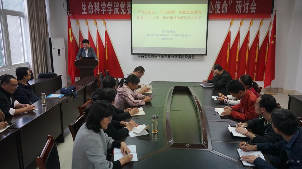 为认真贯彻落实中央、省委、校党委“不忘初心、牢记使命”主题教育活动部署,深入贯彻党的十九大精神,按照学院《关于开展“不忘初心、牢记使命”主题教育的实施方案》要求,10月9日,我院教工第一、第五党支部于生物楼412会议室开展“不忘初心、牢记使命”主题教育专题党课学习活动,党课由我校遗传研究所副所长、我院纪检委员饶本强主讲。
