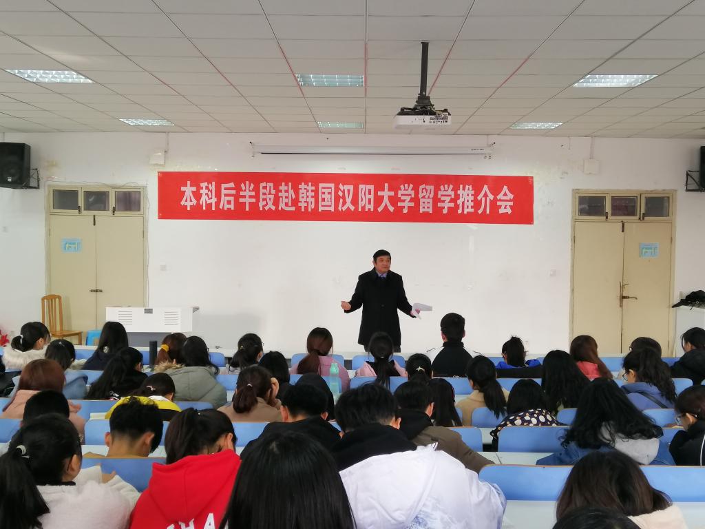 12月12日午间,经初步出国留学简单动员之后,我院两个年级生物技术专业和生物科学以及部分生物制药专业仍然有兴趣的逾百名大学生,齐集生物楼414教室,聆听生科院分党委副书记杨霁虹主讲的赴韩国汉阳大学非项目生再动员报告会,辅导员杨娟娟主持报告会。