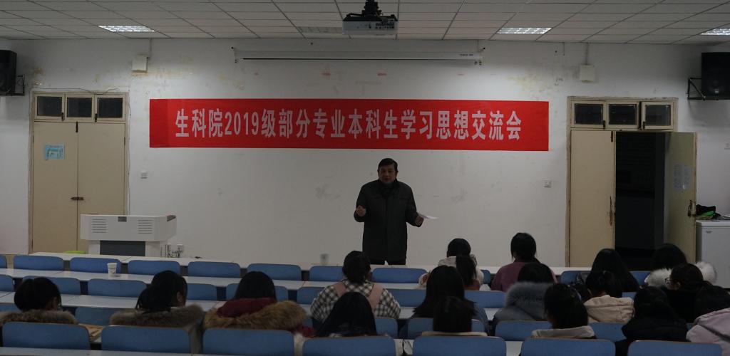 12月16日,我院在生物楼414教室,召开2019级新建专业本科生学习思想交流会,邀请生科院党委副书记杨霁虹开讲,辅导员杨娟娟主持。