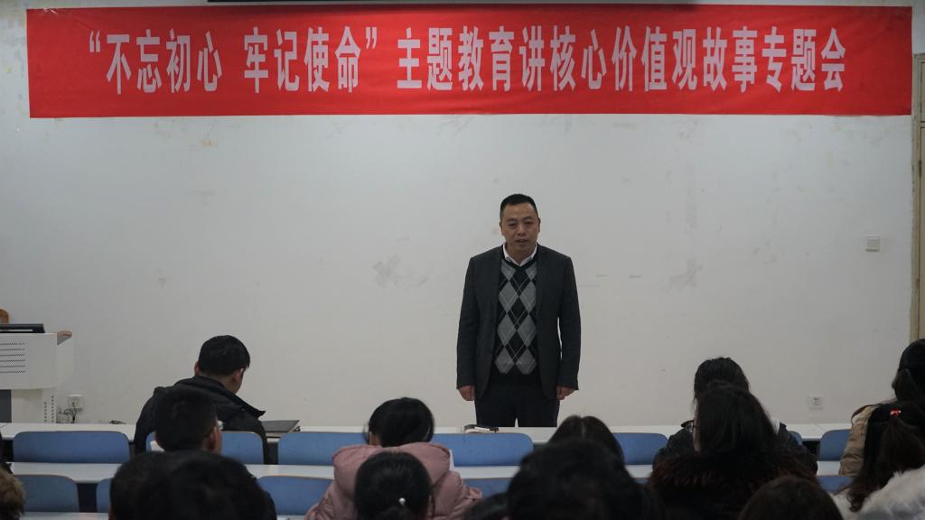 为深入贯彻落实习近平新时代中国特色社会主义思想,宣传弘扬“不忘初心,牢记使命”主题教育精神,12月17日,我院于生科楼414多媒体教室召开“不忘初心,牢记使命”主题教育讲核心价值观故事专题会议。此次会议由党委书记李向阳主持,党委委员宋新强与我院全体教职工共同参与。