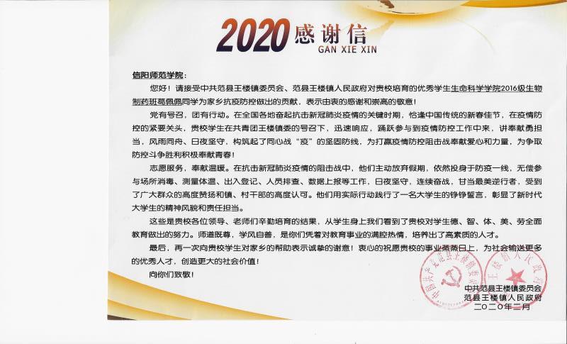 我院2016级生物制药专业大学生葛佩佩同学,在家乡——濮阳市范县王楼镇葛庄村,志愿参加乡、村两级抗疫协理员工作,每天上午9点到晚间9点,承担乡(村)隔离村民信息计算机录入,随机参加2个路口卡点过往人员的测温、询问,并每周1天定时定点主持留守儿童的慰问、辅导工作,凭借过硬的专业功底、奉献精神,投身抗疫,忘我工作,被家乡党委政府隆重表彰。