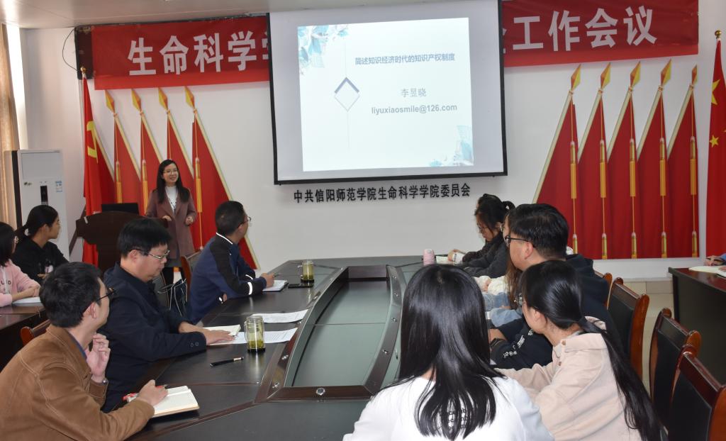 10月23日,学校科技处和校“河南省知识产权运营管理中心联合组织邀请我校法学与社会学院李昱晓博士在生物楼412会议室作了题为“简述知识经济时代的知识产权制度”的报告。报告会由校遗传研究所副所长饶本强教授主持,校科技处邱洋博士及我院相关教师、硕士研究生和本科生聆听了报告。