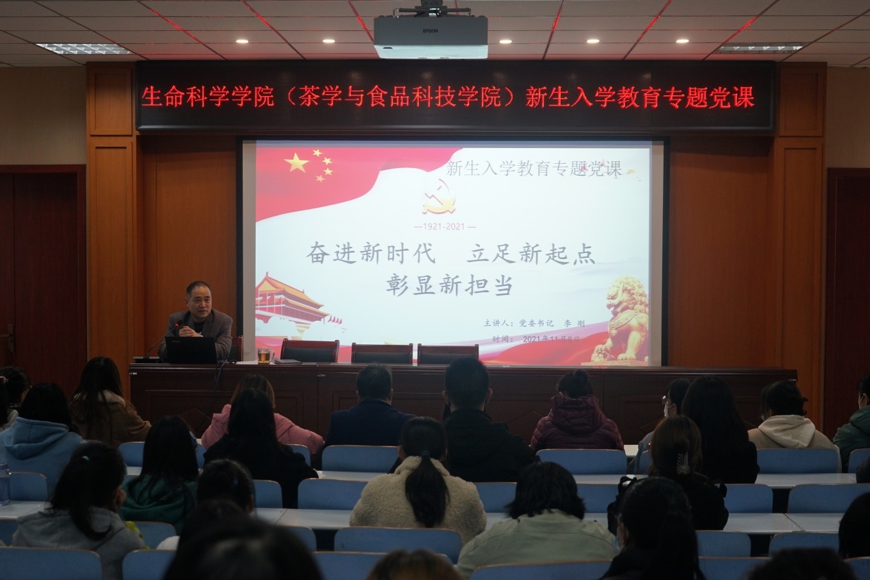 为深入学习贯彻习近平新时代中国特色社会主义思想,扎实推进党史学习教育走深走实,引领广大新生厚植爱党爱国主义情怀,帮助扣好人生“第一粒扣子”,11月10日晚7点,bevictor伟德官网(茶学与食品科技学院)党委书记李刚于生科楼414多媒体报告厅开讲“奋进新时代 立足新起点 彰显新担当”专题党课,带领全体辅导员和2021级新生班干部及学生会干事在重温党史故事、感悟信仰力量中学史明理、学史增信、学史崇德、学史力行。会议由学院党委副书记荣宪举主持。