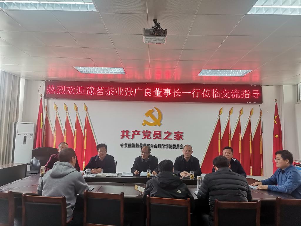 院长饶本强首先向张广良一行介绍了我院茶学学科平台建设和茶学专业发展情况,充分肯定了豫茗茶业在学生制茶学实习、教师科研用地、产学研合作等方面提供的便利条件。张广良介绍了豫茗茶业发展情况和本次学习交流的目的。副院长周棋赢说明2021年河南省工程技术研究中心重点建设领域、申报条件和程序等问题。江昌俊根据企业的优势和发展规划,带领大家集思广益,为豫茗茶业拟定了信阳毛尖品质再提升、信阳红茶产品的开发、乌龙茶的试研制、豫南茶树种质资源创新与利用等4个发展方向。