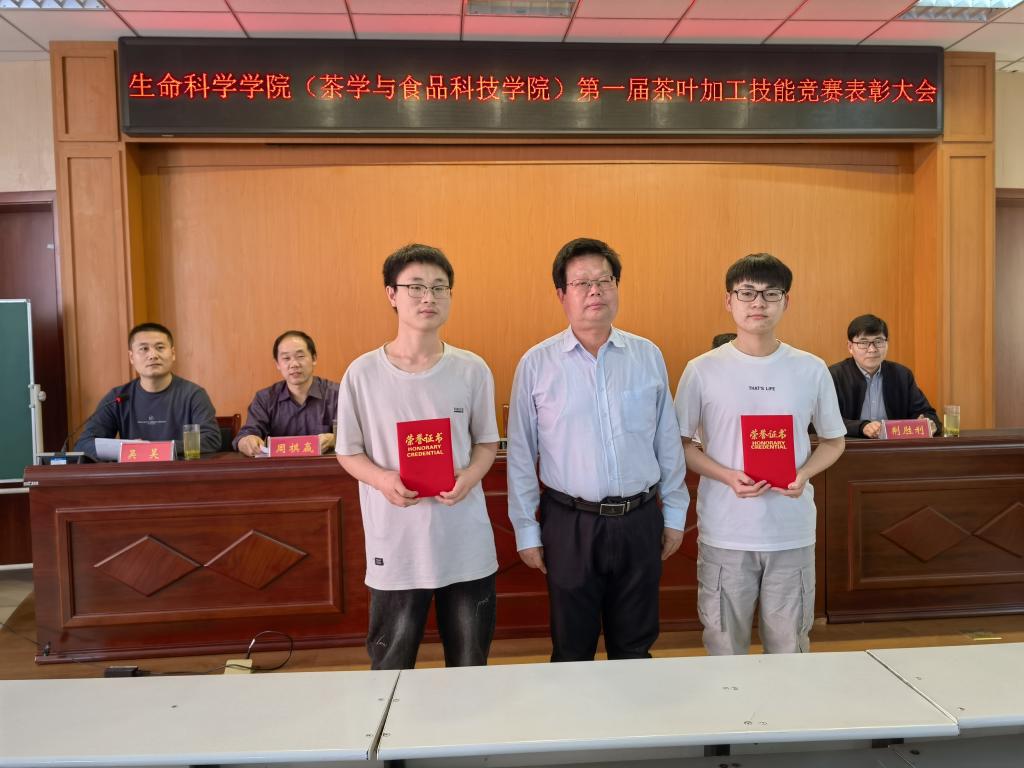 会上,周棋赢副院长宣布了大学生第一届茶叶加工技能竞赛活动获奖名单。与会领导为获奖学生颁发了荣誉证书和奖品。院长饶本强做了总结讲话。他首先代表学院,祝贺学院第一届茶叶加工技能竞赛圆满成功,祝贺21位获奖同学,并对茶学专业师生提出三点希望。一是希望茶学专业师生,以此次竞赛活动为契机,进一步丰富文化活动。本次活动,学院很重视,提供了证书,奖品等。以后在茶学专业实习或实践中,应该把活动进一步丰富起来,如评茶比赛、茶艺比赛、茶知识竞赛等。茶叶加工技能竞赛,可以扩大到学校层面,分专业组和非专业组,吸引更多感兴趣的学生参加,扩大活动的影响力和茶学专业的知名度。二是希望茶学专业师生,进一步树立稳定的专业思想。中国拥有世界上规模最大的茶叶科技创新团队、最显著的创新成果,对茶产业发展所起的推进作用也是最明显的。信阳师范学院又是离信阳茶叶主产区最近的高校,茶学学科是生科院的优势学科和特色学科。茶学专业具有生物科学国家一流专业建设点、“大别山特色农业生物资源保护与利用”河南省特色骨干学科群、河南省茶树生物学重点实验室等科研创新平台支撑,条件很优越。希望同学们进一步树立专业思想,把茶文化、茶产业、茶科技这篇文章做好。三是希望全体师生,进一步加强“课程思政”育人理念。实习工作中,最容易融入思政元素,实现课程思政与专业教育的协同效应。在以后的专业教学和实习工作中,希望全体师生进一步加强一流专业育人、特色学科育人、重点实验室育人的课程思政理念,激发学学农爱农热情,培养深厚的懂农业、爱农村、爱农民的“三农”情怀,激活 “乡村振兴”的责任意识、使命担当,推动茶学专业更好更快发展。